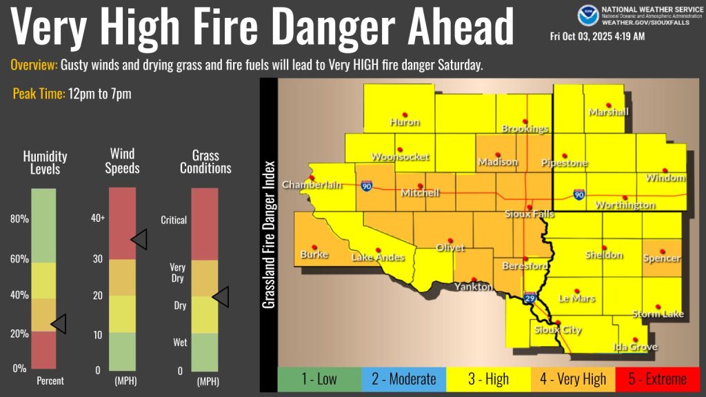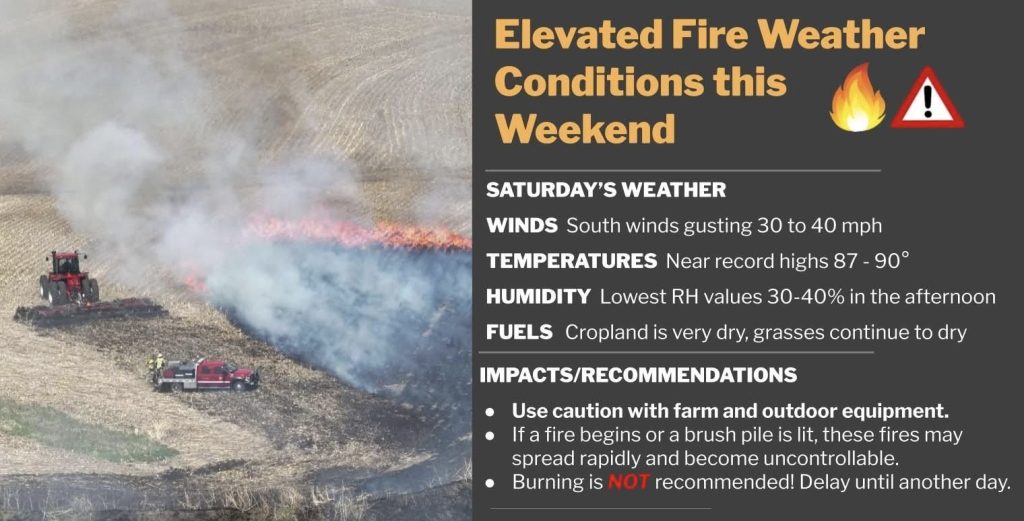 Sioux County Emergency Management is warning residents about high fire danger this weekend. Strong southerly winds, with gusts between 35 and 45 miles per hour, combined with dry conditions, are expected Saturday afternoon and evening.