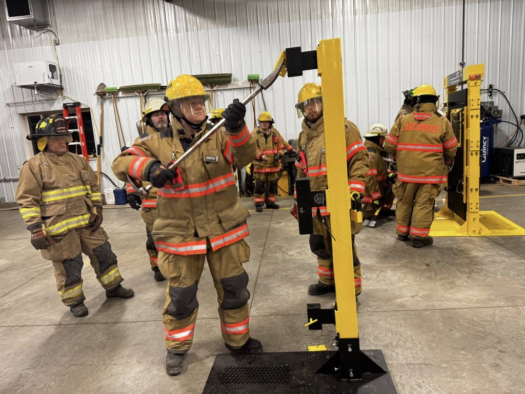The Siouxland Community Foundation awarded $7,500 for the package, and the Hawarden Community Foundation matched that amount. The funding allowed Hawarden to purchase three separate training props, including a full-force door, an all-in-one prop for saw and hinge work, and a commercial steel door simulator.