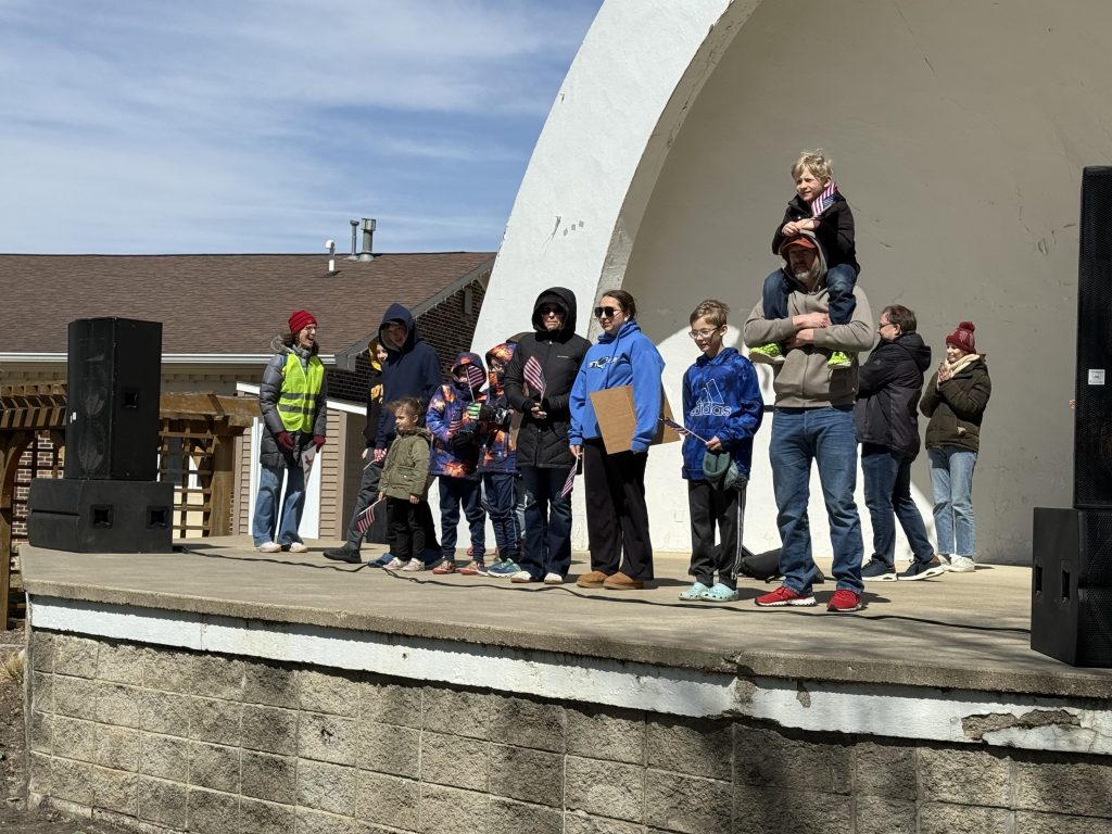 The event started at the band shell, where a sound system and music were set up ahead of the program, with a local DJ providing audio for speakers. Several speakers addressed the crowd before participants later moved to line Highway 75 with signs and American flags.