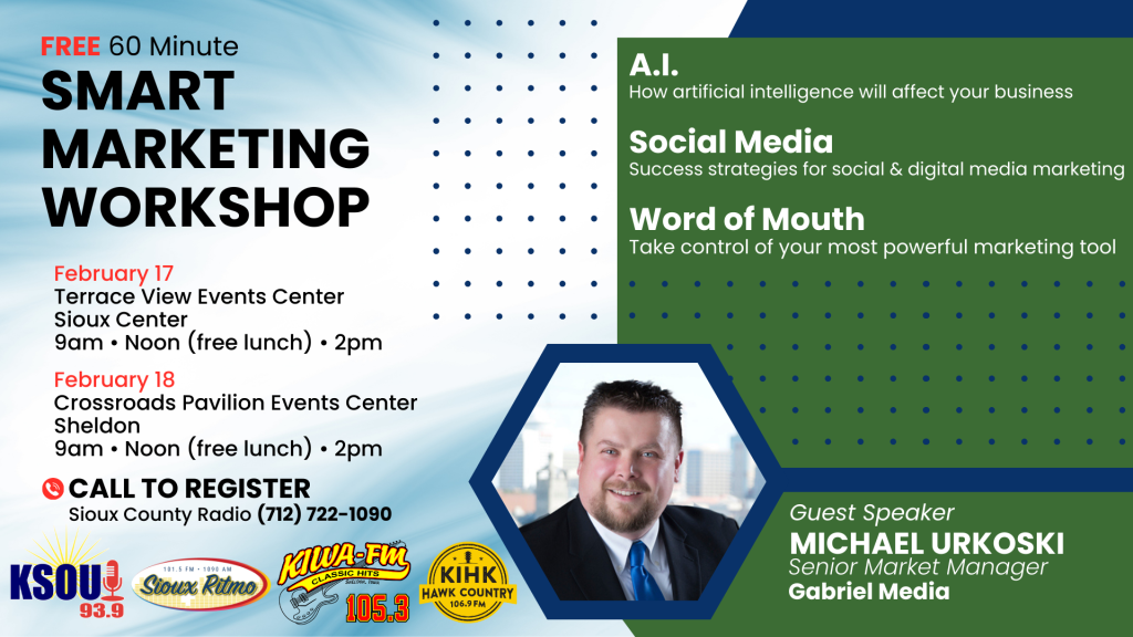 Marketing a business has really changed over the past decade. Michael Urkoski from Gabriel Media will be doing free, 60 minute small business marketing seminars in Sioux Center and Sheldon February 17-18. In this episode he talks about will people will learn.